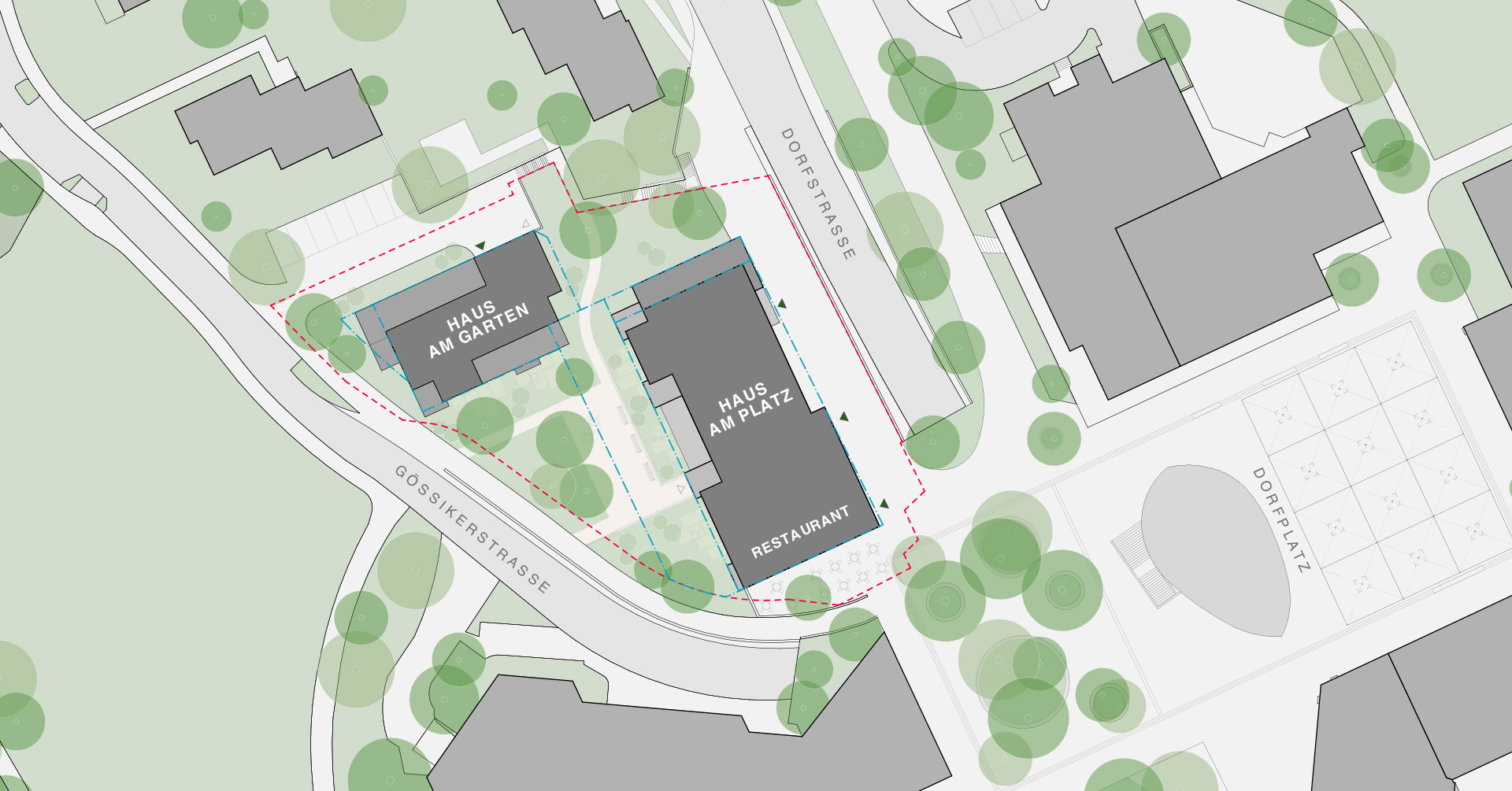 Ein zentrales Anliegen der Neugestaltung ist der Ausgleich des bisherigen Niveauunterschieds zwischen dem Dorfplatz 13 und dem Dorfplatz. Die bestehende Verbindung von der ehemaligen Metzgerei Schweizer hinunter zur Gössikerstrasse bleibt als Fuss- und Veloverbindung erhalten.